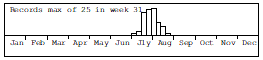 Yellow Rose Tortrix Common in the north of the County and is probably overlooked elsewhere First and last flight dates recorded in Caithness: 3rd July to 24th August ![]() MAP: red dots last record 2010 to 2019 green dots last record 2020 to present |