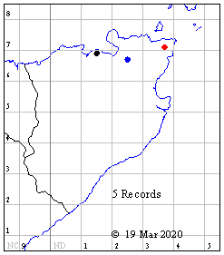 | Current status unknown. Recent records from ND26 in 2006 and ND37 in 2019 One record from Murkle Rothamsted site in 1991 and 2 historic records from Lybster and Wick Rosie described it as not too common and possibly overlooked. Photo © Mark Pewtress Scottish Status: Common E scarcer W - decline in numbers. UK Status: Common UK distribution has declined significantly and abundance severely since 1970 (cf: Atlas of Britain & Ireland;'s Larger Moths) First and last flight dates recorded in Caithness: 29th July to 24th August ![]() MAP: black dot last record pre 2000 blue dot last record 2000 to 2009 red dot last record 2010 to 2019 |